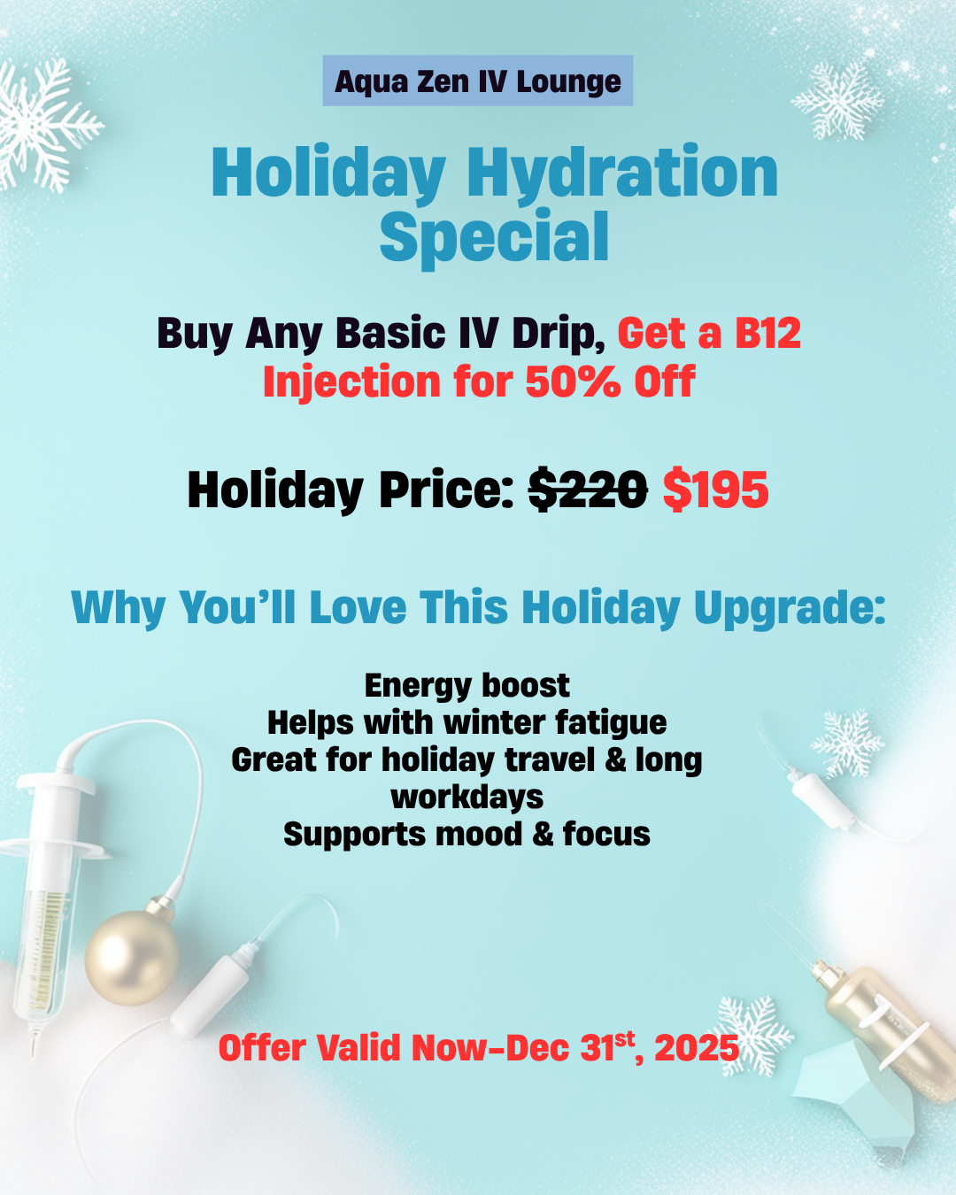 At Aqua Zen IV Lounge, we're committed to using only the highest-quality ingredients in our IV therapies. Our infusions are carefully formulated with essential vitamins, minerals, and antioxidants to deliver safe and effective results, helping you achieve your wellness goals.